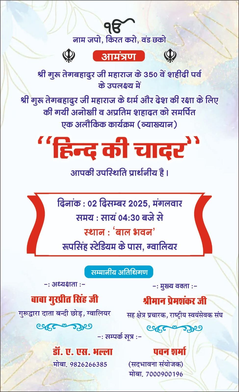 गुरु तेगबहादुर के शहीद दिवस पर व्याख्यान 2 दिसंबर को